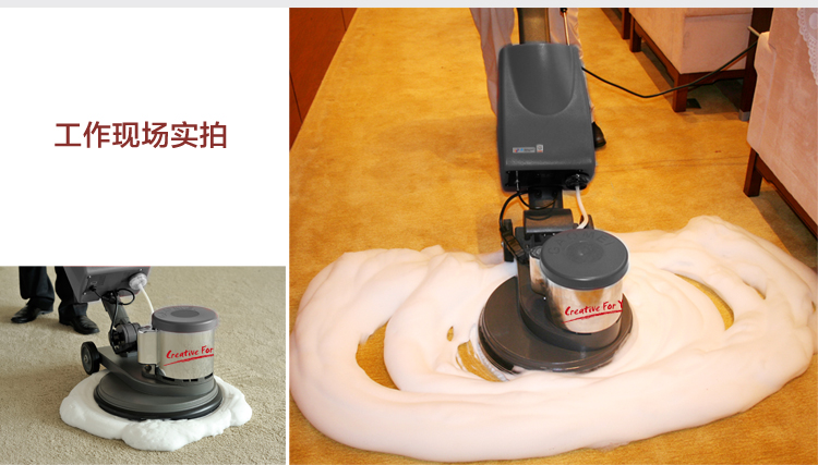 高美地毯清洗机独家技术优势: 1. 干泡清洗地毯,2 小时即可干燥营业,确保地毯日久长新的美观面貌。 2. 解决了擦机配水箱湿洗地毯的方式,使地毯越洗越脏,1-2年就洗坏的现象。 3. 高效解决明显污垢,适合各类物业地毯清洗。 4. 解决了传统泡箱配擦机难清洗干净明显污垢的难题。 5. 内置启动开关保险、安全简便。 6. 独特的手柄连接设计,拆装方便。